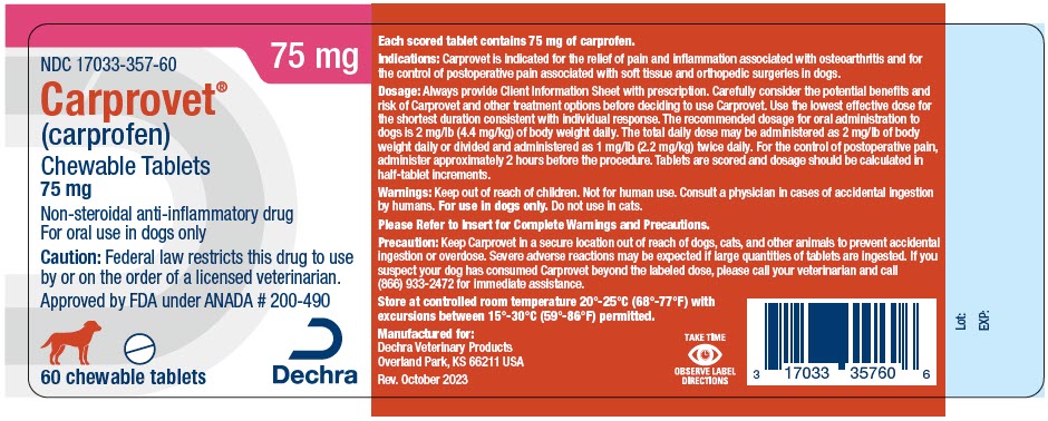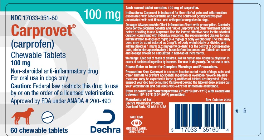 Carprovet is a nonsteroidal anti-inflammatory drug (NSAID) that is used to reduce pain and inflammation (soreness) due to osteoarthritis and pain following surgery in dogs. Carprovet is a prescription drug for dogs. It is available as a chewable tablet and is given to dogs by mouth.