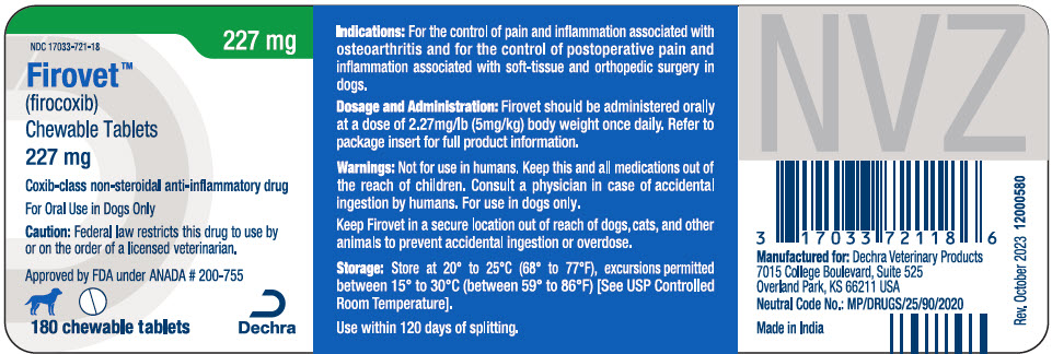 Indications: Firovet (firocoxib) chewable tablets are indicated for the control of pain and inflammation associated with osteoarthritits and for the control of postoperative pain and inflammation associated with soft-tissue and orthopedic surgery in dogs.
