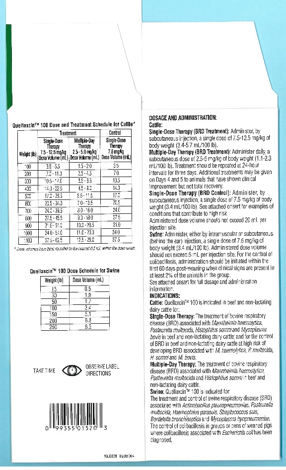 Quellaxcin™ 100 may be administered as a single dose for one day for treatment and control of BRD (cattle), for treatment and control of SRD or for control of colibacillosis (swine), or for multiple days for BRD treatment (cattle). Selection of the appropriate dose and duration of therapy for BRD treatment in cattle should be based on an assessment of the severity of the disease, pathogen susceptibility and clinical response.