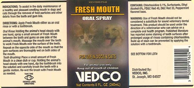 Oral Rinse: Holding the animal's head steady with one hand, spray a small amount of Fresh Mouth between the teeth and gums on one side of the animal's mouth. Massage the mouth over the teeth to work Fresh Mouth over the surface of the teeth. Repeat on the opposite side of the mouth so that the gum surfaces are thoroughly wet on both sides of the mouth.
