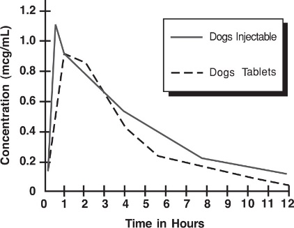 A graph indicating the mean serum levels following a dose of 2.5 mg/kg (1.13 mg/lb) in dogs (oral and intramuscular) is shown in Figure 1.