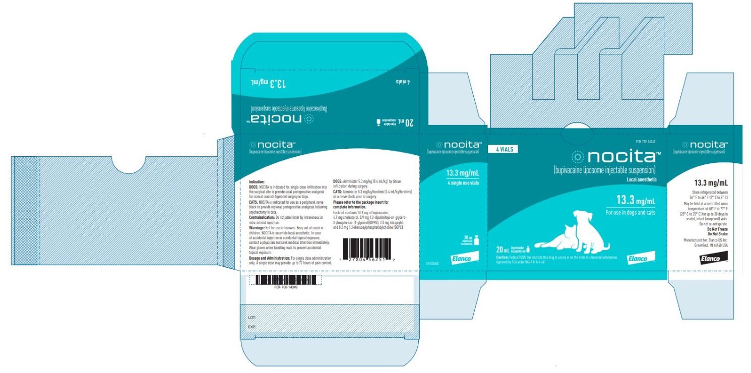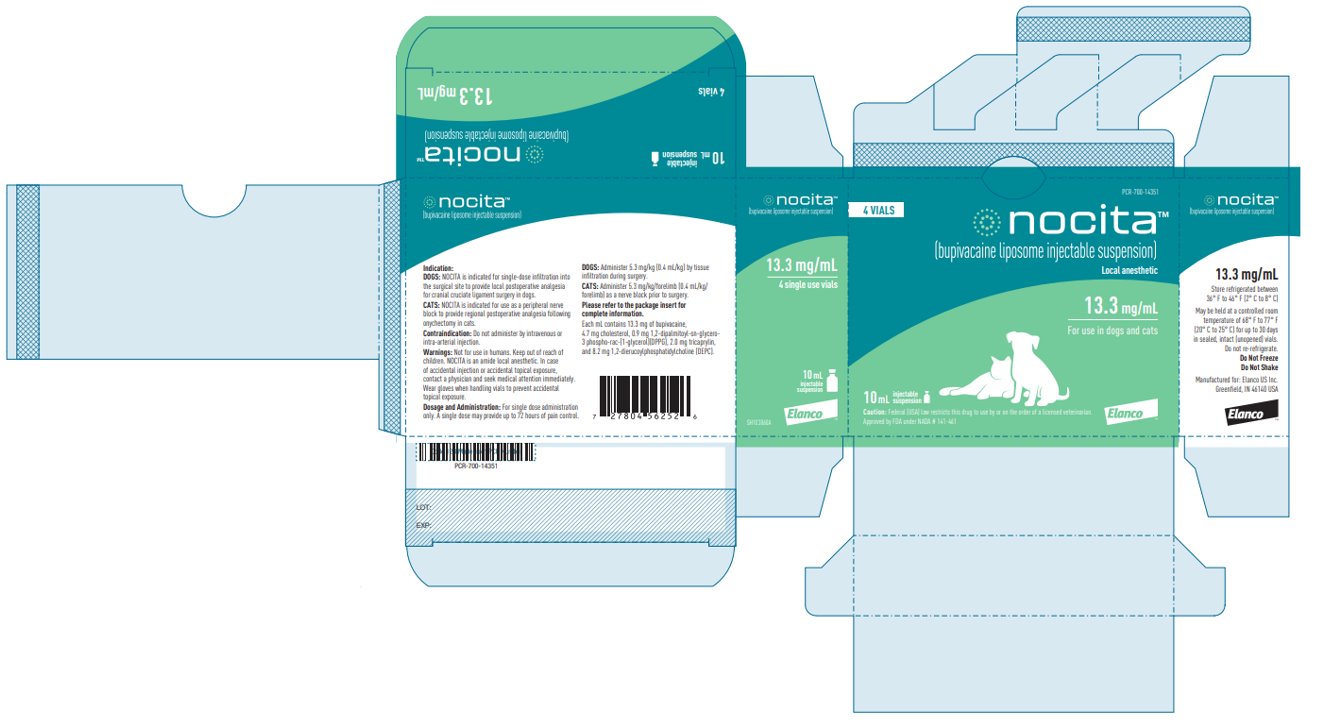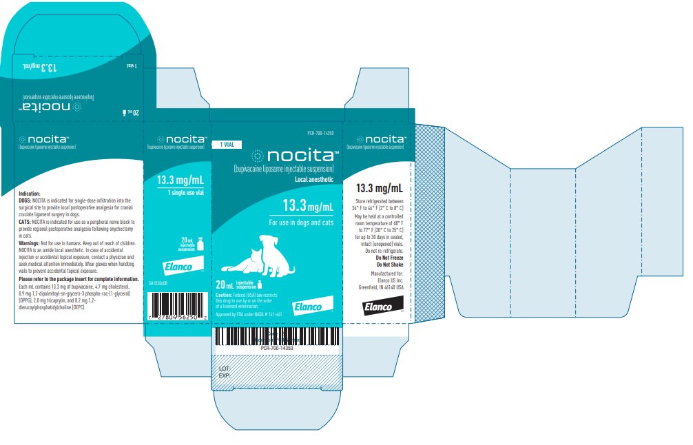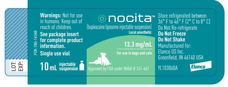 In a 22 day laboratory study, 40 healthy cats (4 cats/sex/group) aged 5-6 months were administered negative control (2.37 mL/kg saline), active control (5.3 mg/kg bupivacaine HCl), or NOCITA at 10.6, 21.2, or 31.8 mg/kg via injection using a suprainguinal approach for a femoral nerve block of the right hindlimb on Days 0, 9 and 18. These NOCITA doses correspond to 1, 2 and 3 times the maximum labeled total dose of 10.6 mg/kg/cat (representing 2, 4 and 6 times the maximum labeled dose of 5.3 mg/kg/forelimb).