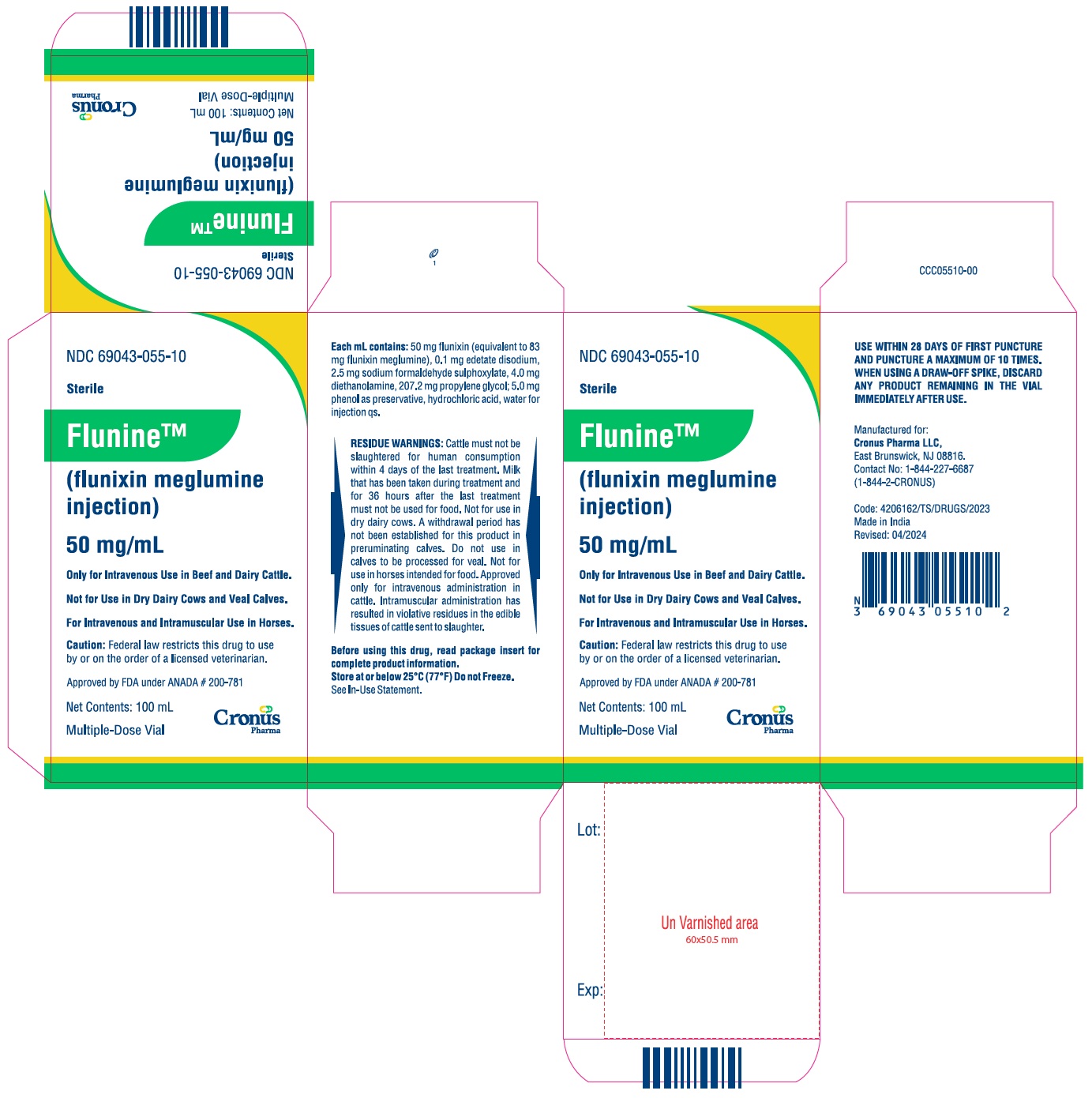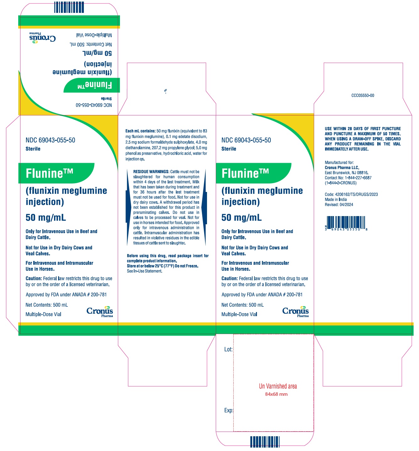 FlunineTM (flunixin meglumine injection), 50 mg/ mL, is available in 100-mL (NDC 69043-055-10), 250-mL (NDC 69043-055-25) and 500-mL (NDC 69043-055-50) multi-dose vials.