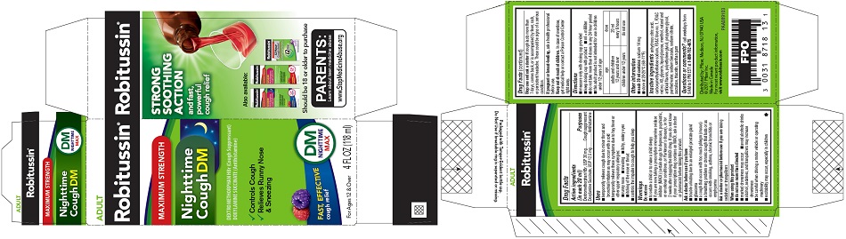 The following image provide visual information about the product associated with Robitussin Maximum Strength Nighttime Cough Dm NDC 0031-8718 by Haleon Us Holdings Llc, such as packaging, labeling, and the appearance of the drug itself. This resource could be helpful for medical professionals, pharmacists, and patients seeking to verify medication information and ensure they have the correct product.