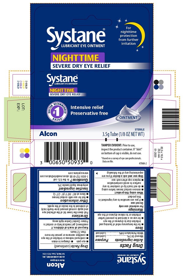 The following 2 images provide visual information about the product associated with Systane Nighttime NDC 0065-0509 by Alcon Laboratories, Inc., such as packaging, labeling, and the appearance of the drug itself. This resource could be helpful for medical professionals, pharmacists, and patients seeking to verify medication information and ensure they have the correct product.