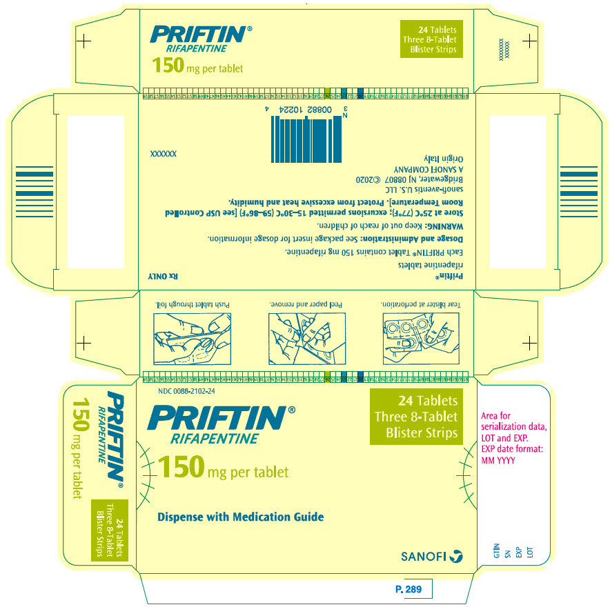 The following 2 images provide visual information about the product associated with Priftin NDC 0088-2102 by Sanofi-aventis U.s. Llc, such as packaging, labeling, and the appearance of the drug itself. This resource could be helpful for medical professionals, pharmacists, and patients seeking to verify medication information and ensure they have the correct product.