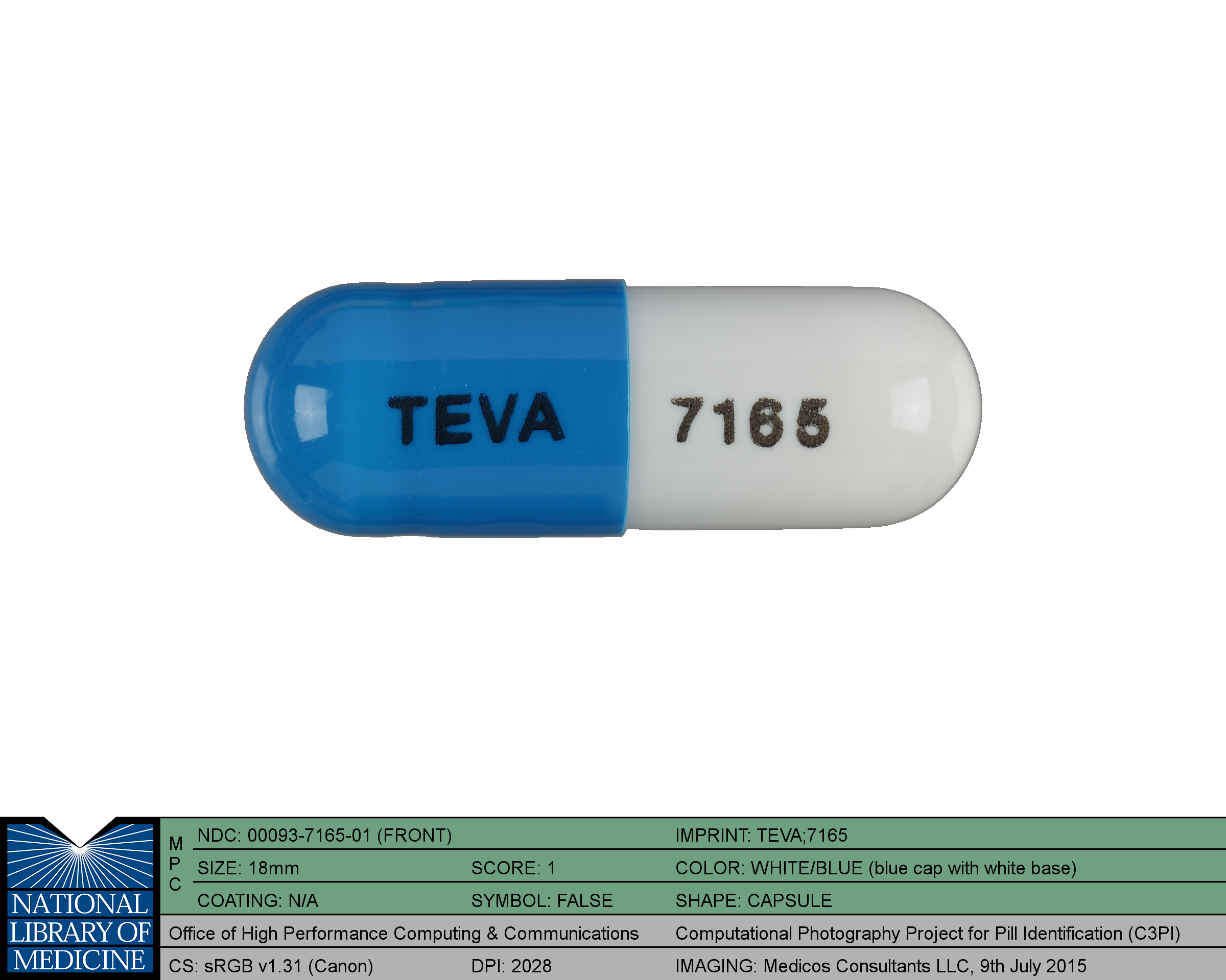Celecoxib by Teva Pharmaceuticals Usa, Inc. is a white and blue capsule about 18 mm in size, imprinted with TEVA and 7165. The product is a with active ingredient(s) . The shape, size, imprinting and color are characteristics of an oral solid dosage form of a medicinal product.
