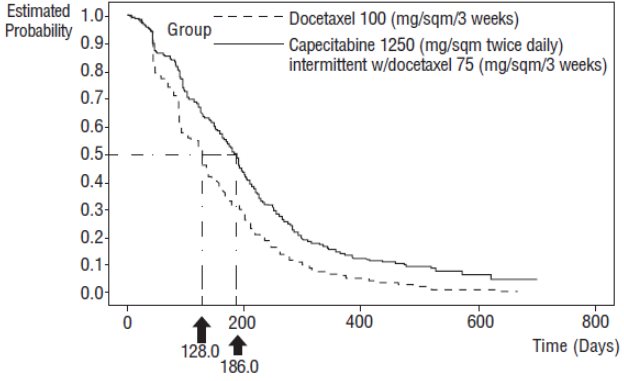The text appears to be a table that includes estimated probabilities for Docetaxel and Capecitabine medication dosages. The dosages are listed in mg/sqm/3 weeks and mg/sqm twice daily, respectively, and are shown in relation to their corresponding probability value. Time is also mentioned in days, but it is unclear how it is related to the medication dosages and probability.*