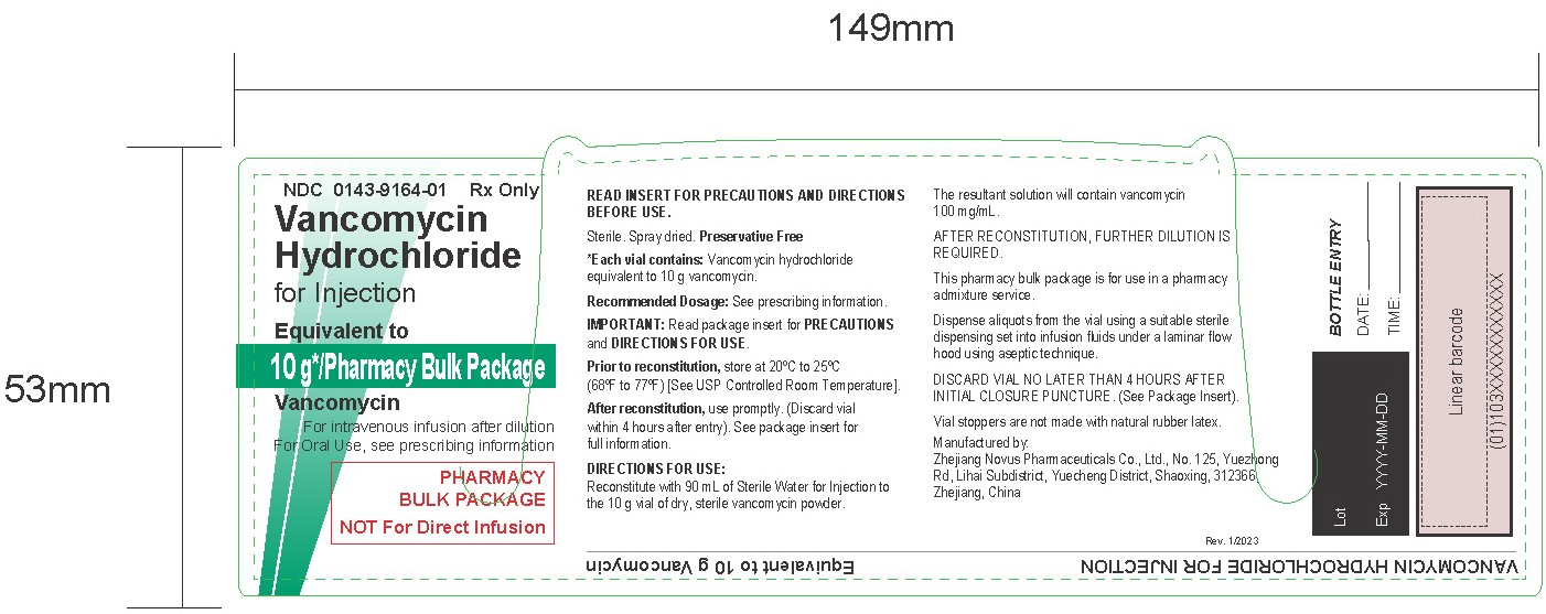 This text contains instructions and precautions for the use of sterile Vancomycin powder. It is a pharmacy bulk package designed for use in pharmacy admixture services. The recommended dosage is not provided, and the package is not for direct infusion. The vial contains 5g of Vancomycin powder to be reconstituted with 45mL of sterile water for injection. The reconstituted solution should be further diluted, aliquots dispensed using sterile dispensing sef into infusion fluids under a laminar flow hood using aseptic technique. The vial needs to be discarded within 4 hours after the initial closure puncture. The package insert includes additional information and directions for use. The manufacturer is Zhejiang Novus Phermeceuticals Co, Lig.*