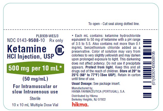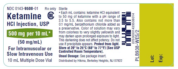 The following 6 images provide visual information about the product associated with Ketamine Hydrochloride NDC 0143-9508 by Hikma Pharmaceuticals Usa Inc., such as packaging, labeling, and the appearance of the drug itself. This resource could be helpful for medical professionals, pharmacists, and patients seeking to verify medication information and ensure they have the correct product.