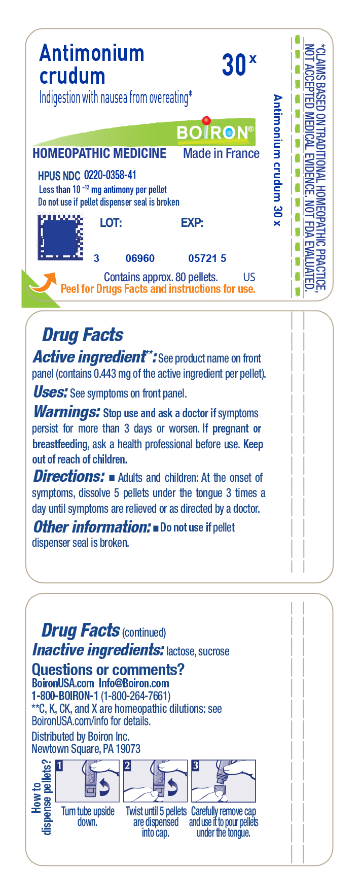 The following 2 images provide visual information about the product associated with Antimonium Crudum NDC 0220-0358 by Boiron, such as packaging, labeling, and the appearance of the drug itself. This resource could be helpful for medical professionals, pharmacists, and patients seeking to verify medication information and ensure they have the correct product.