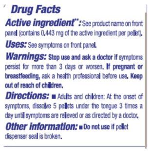This is a drug facts label for a medication that contains an active ingredient named "s prosuctname" and provides 0.443 mg of the active ingredient per pellet. The symptoms that the medication could relieve are mentioned on the front panel of the packaging. The label instructs to seek a doctor if symptoms persist for more than three days or worsen and consulting a healthcare professional if pregnant or breastfeeding. It is suggested to keep the medication out of children's reach. The instructions are to dissolve 5 pellets under the tongue three times a day at the onset of symptoms, until symptoms ease or as directed by a physician. The label contains a warning to not use the medication if the pellet dispenser seal is broken.*