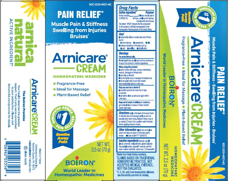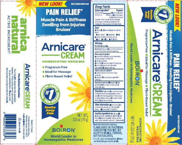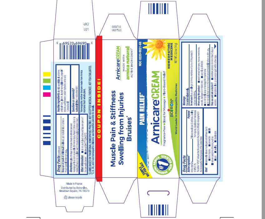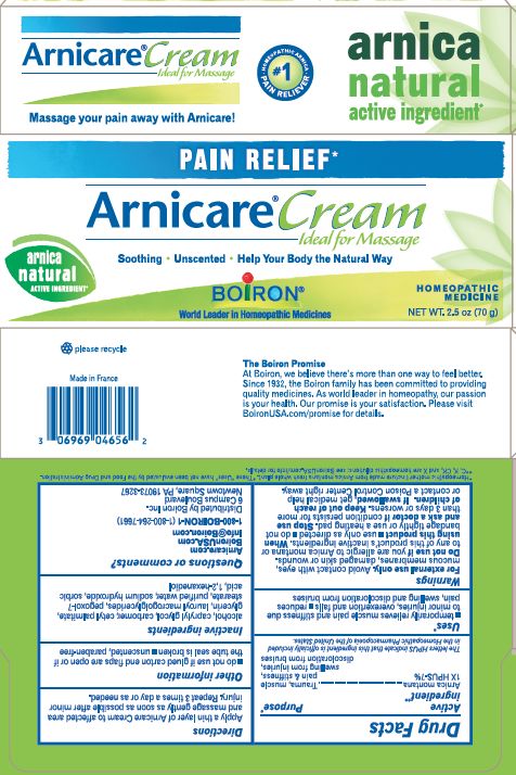 This appears to be a product label for a pain relief cream called "Arnicare". It is a homeopathic medicine for muscle pain and stiffness, swelling from injuries, and bruises. The cream is plant-based, fragrance-free, and ideal for massage. The label also includes some manufacturing and packaging information.*
