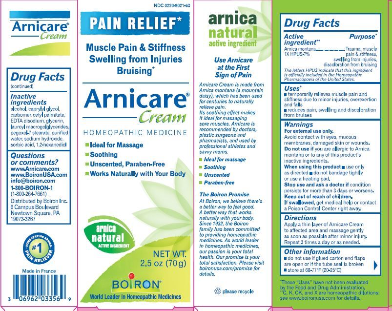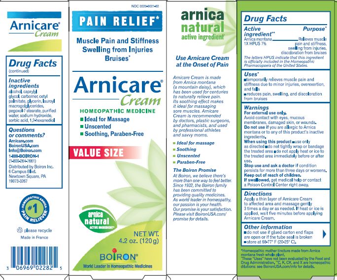 Arnicare Cream is a homeopathic remedy for muscle pain, stiffness, swelling from injuries, and bruising. The active ingredients are Amica Montana, carpylic/capric triglycerides, and sorbitan palmitate. This cream is recommended by doctors, pharmacists, and professional athletes. The cream is applied topically and massaged onto the affected areas up to three times a day or as needed. Keep out of reach of children and do not swallow. For more information, contact the manufacturer or consult a doctor if you have any specific condition. Made in France.*