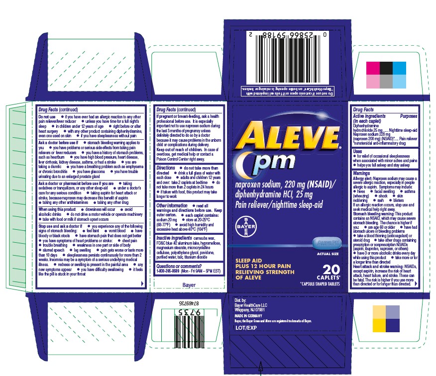 This is a description of a medication that combines naproxen and diphenhydramine HCl. It is a pain reliever and a night-time sleep-aid. It is a caplet-shaped medication with a 12-hour pain-relieving strength. It is marketed as a sleep aid and pain reliever under the brand name "Aleve."*