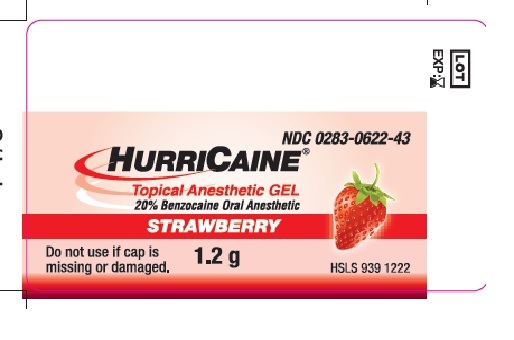 This is a product label for a topical anesthetic gel called "HURRICAINE". The NDC number for the product is 0283-0622-43. The label has a warning not to use the product if the cap is missing or damaged. The code "HSL5 939 1222" might be a batch number or a manufacturing code. The text "Xaa = 1" is unrelated to the product and its purpose is not clear.*