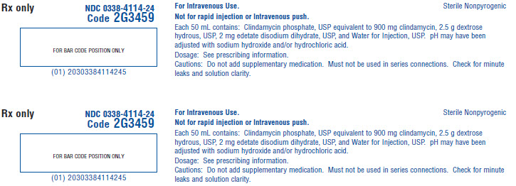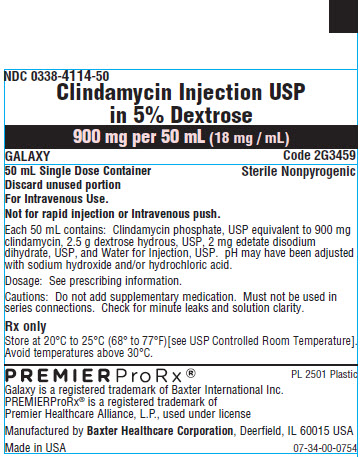 This is a description of Clindamycin Injection USP in 5% Dextrose, which contains 900mg per 50mL. It is assigned with Code 2G3459 and NDC 0338-4114-24. It should be stored in a controlled room temperature of 20°C to 25°C (68°F to 77°F) to avoid temperatures above 30°C. The product is labeled with the brand name PREMIERProRx®. However, towards the end of the text, there are seemingly random characters and numbers that do not convey any meaningful information.*