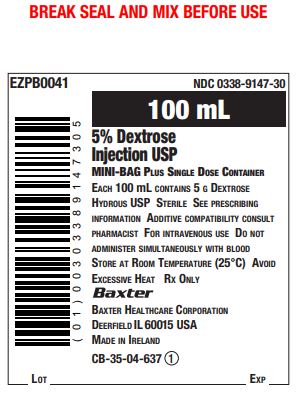 This is a label for a bottle of 5% Dextrose Injection USP manufactured by Baxter. The label indicates that the bottle should be broken and mixed before use. The bottle contains 100 mL of solution and is intended for intravenous use. The NDC number for the product is 0338-9147-30. However, there are some typos on the label, such as "INI-BAG Puus Swts Dose Conranen" and "Srense Stz mescnam," which may indicate potential errors or issues with the product.*