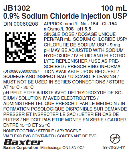 This is a 100 mL single dose bag of 0.9% Sodium Chloride Injection USP, with a pH of 5.5 and sodium of 154 mmol/L and chloride of 154 mmol/L. The bag can be adjusted with sodium hydroxide and used as prescribed. The information on dosing is available on request. The bag should be squeezed and inspected before use, and discarded if leaking. It should not be used in series connections and must be stored between 15°C - 25°C. The container is nonpyrogenic and sterile, made of PVC, and produced by Baxter Corporation in Mississauga, ON.*