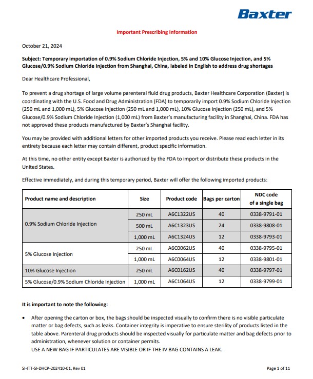 This text provides important prescribing information from Baxter Healthcare Corporation regarding the temporary importation of various parenteral solutions manufactured in Shanghai, China. The imported products include 0.9% Sodium Chloride Injection, 5% and 10% Glucose Injection, and 5% Glucose/0.9% Sodium Chloride Injection. The letter emphasizes the need for visual inspection of the bags to ensure there is no particulate matter or defects, to maintain container integrity for product sterility. It specifies the product names, sizes, and product codes for each item being imported. Baxter is working with the FDA to address potential drug shortages through this temporary importation.*