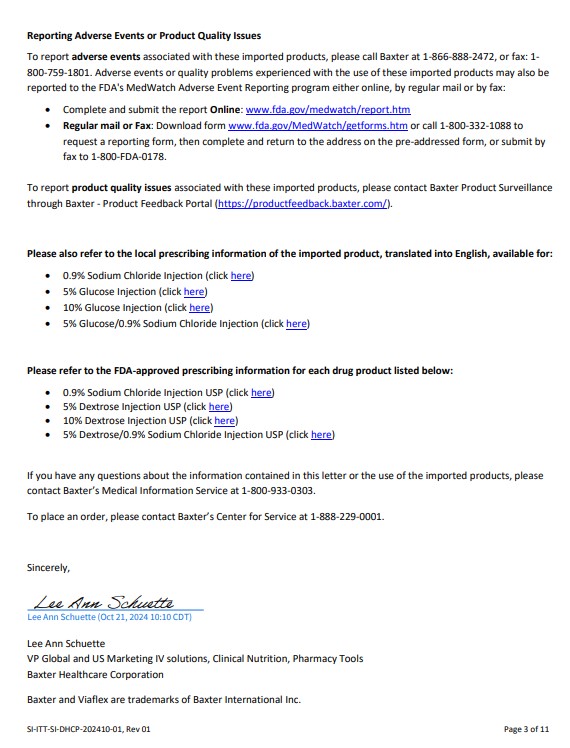 This text provides information on how to report adverse events or product quality issues related to imported products. It includes contact information for Baxter, the FDA's MedWatch Adverse Event Reporting program, and a portal for reporting product quality issues. It also mentions the availability of prescribing information for various drug products and provides contact details for inquiries and placing orders with Baxter.*
