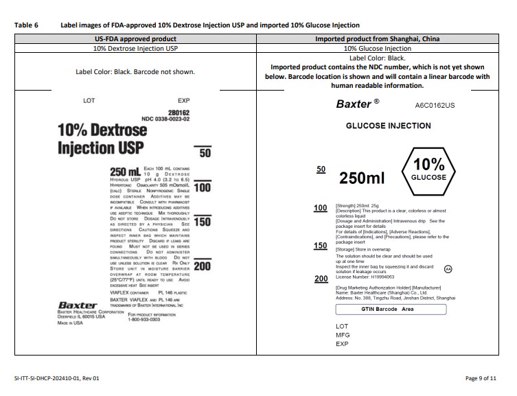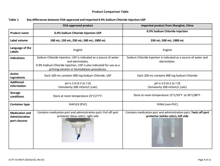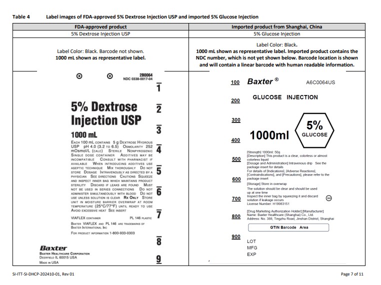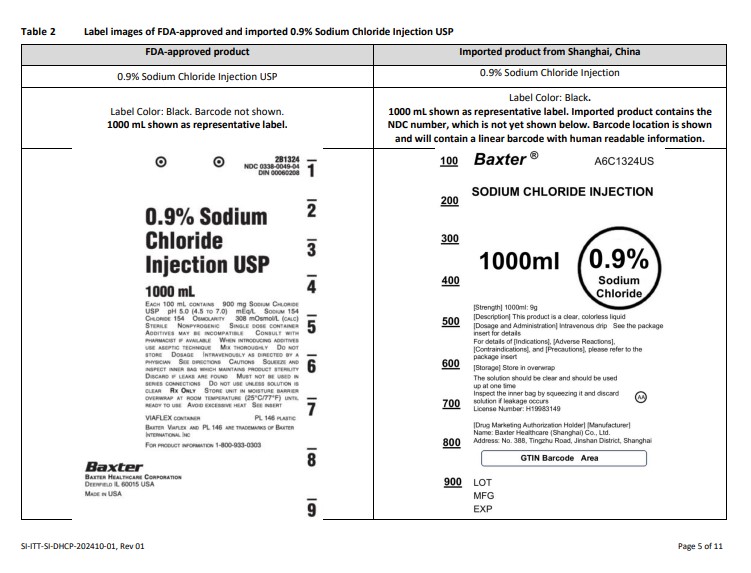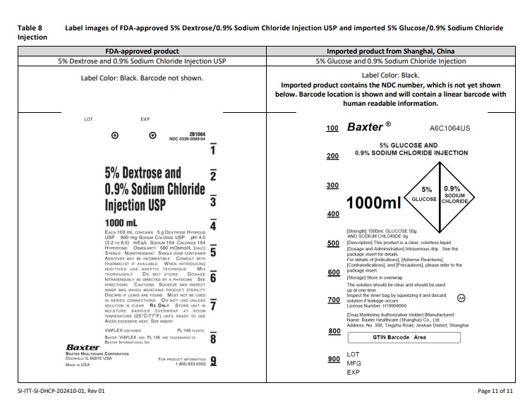 The provided text appears to be a description of FDA-approved and imported 0.9% Sodium Chloride Injection USP products that are being evaluated. The information includes details such as the label design, label color, brand names (Baxter), and mention of the NDC number present in the imported product. The text mentions that the imported product contains a linear barcode with human-readable information, implying an advanced tracking system. The evaluation also refers to the origins of the imported product from Shanghai, China. Overall, the text provides insights into the labeling and packaging of these medical products for assessment purposes.*