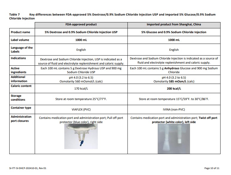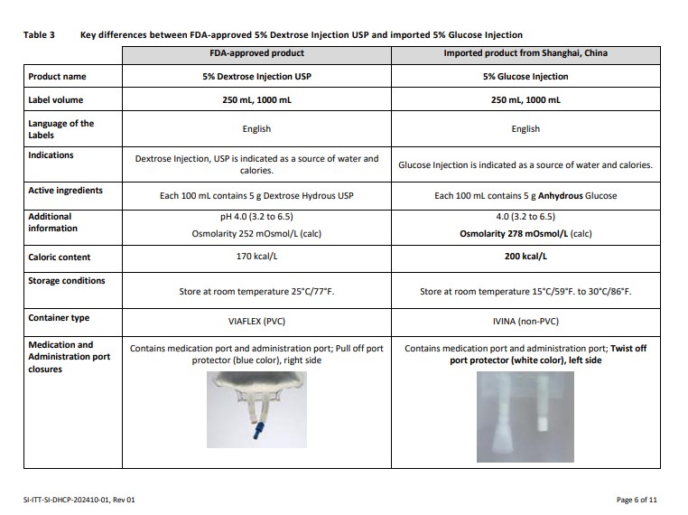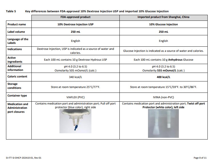 This is a comparison between FDA-approved 10% Dextrose Injection USP and imported 10% Glucose Injection from Shanghai, China. The key differences include product name, label volume, language on labels, indication as a source of water and calories, active ingredients, osmolarity, caloric content, storage instructions, container type, and administration components. This information can help in understanding the differences between these two products and their suitability for various medical purposes.*