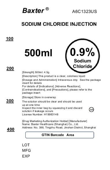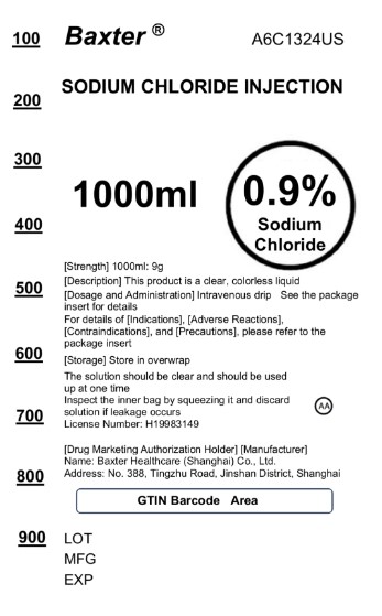 Product Name: Baxter A6C1324US Sodium Chloride Injection 1000ml Description: This product is a sterile, colorless liquid for intravenous use. Refer to the package insert for dosage and administration instructions. Storage: Store in overwrap. Important: The solution should be clear and should be used immediately after opening. Do not squeeze the bag and discard if the solution is not clear. Manufacturer: Baxter Healthcare (Shanghai) Co., Ltd. Address: No. 388, Tingzhu Road, Jinshan District, Shanghai GTIN Barcode available. Refer to packaging for details on Indications, Adverse Reactions, Contraindications, and Precautions.*