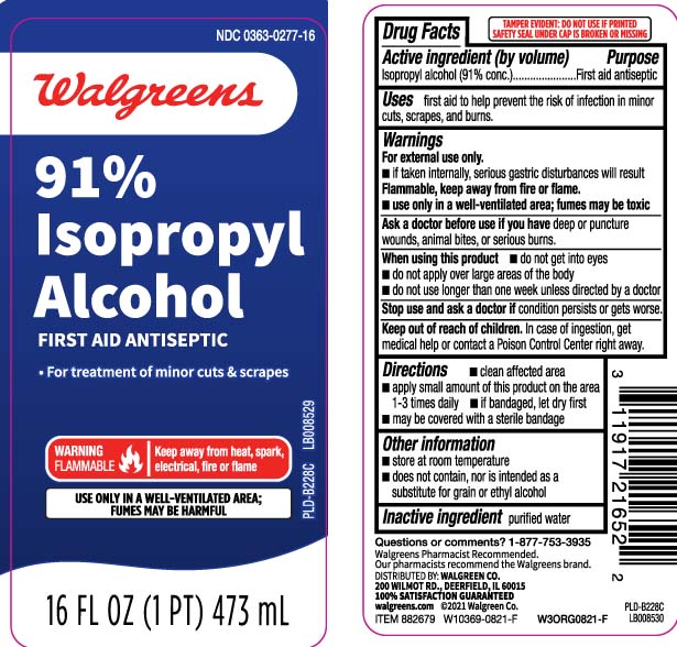 The following image provide visual information about the product associated with Isopropyl Alcohol 91 Percent NDC 0363-0277 by Walgreens, such as packaging, labeling, and the appearance of the drug itself. This resource could be helpful for medical professionals, pharmacists, and patients seeking to verify medication information and ensure they have the correct product.