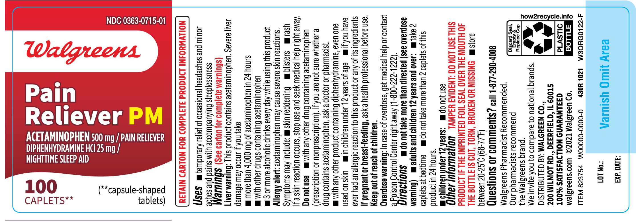 The following 2 images provide visual information about the product associated with Extra Strength Nite-time Pain Relief NDC 0363-0715 by Walgreens, such as packaging, labeling, and the appearance of the drug itself. This resource could be helpful for medical professionals, pharmacists, and patients seeking to verify medication information and ensure they have the correct product.