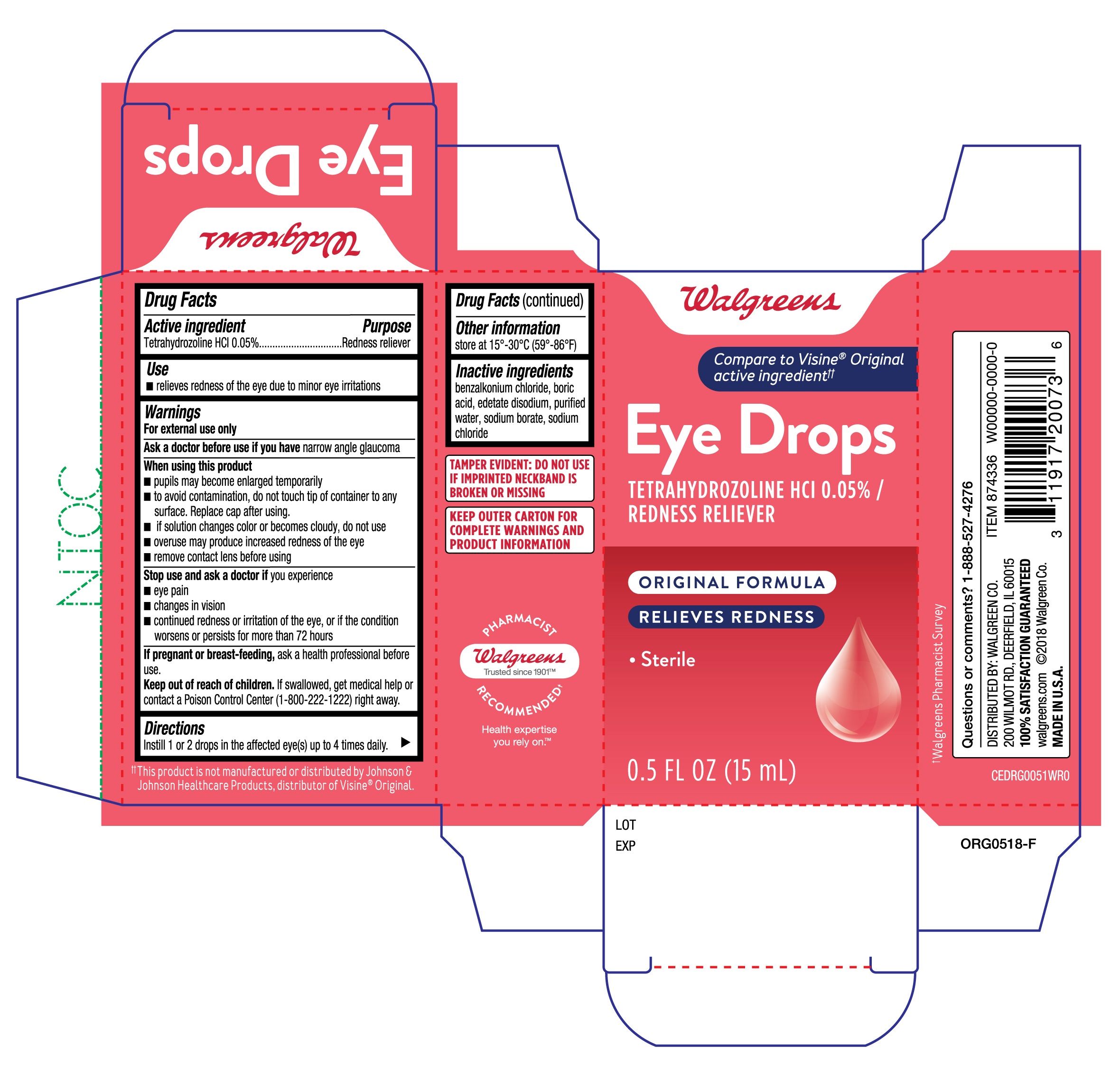 This is a drug facts sheet for a product sold at Walgreens, which contains Tetrahydrozoline HCI 0.05%. The product is an original formula for relieving redness of the eye due to minor eye irritations, and it is sterile. The text provides directions for use, warnings, and information about the inactive ingredients in the product. It also includes contact information for customer service.*