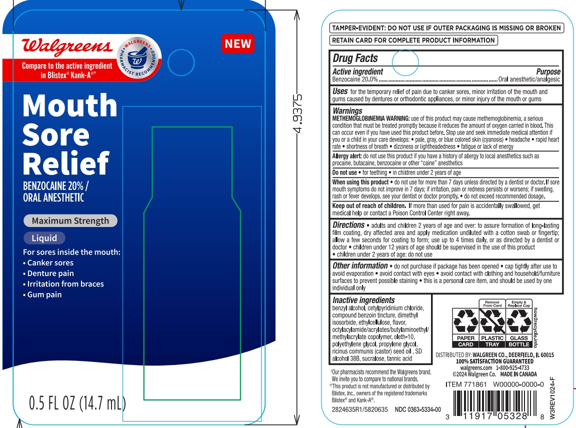 The following image provide visual information about the product associated with Walgreens Mouth Sore Relief NDC 0363-5334 by Walgreens, such as packaging, labeling, and the appearance of the drug itself. This resource could be helpful for medical professionals, pharmacists, and patients seeking to verify medication information and ensure they have the correct product.