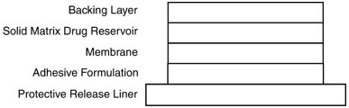 This appears to be a diagram or image labeling parts of a drug delivery system. The system is composed of a backing layer, a solid matrix drug reservoir, and a membrane. An adhesive formulation is also part of the system. The protective release liner is likely the outermost layer that is removed before using the drug delivery system.*