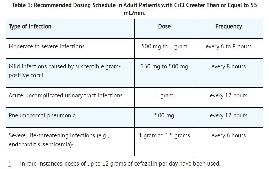 The recommended adult dosages are outlined in TABLE 1. Cefazolin for Injection should be administered intravenously or intramuscularly.