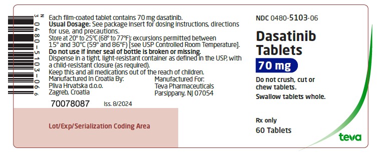 Each film-coated tablet contains 20 mg of dasatinib. The usual dosage instructions can be found in the package insert, including dosing guidelines, usage directions, and precautions. The tablets should be stored at a temperature between 20°C to 25°C (68°F to 77°F) with excursions permitted between 15°C and 30°C (59°F and 86°F). It is important not to use the tablets if the inner seal of the bottle is broken or missing. The medication should be kept in a tightly sealed, light-resistant container with a child-resistant closure, as per USP standards. For safety, keep all medications out of the reach of children. These dasatinib tablets are manufactured in Croatia by Piva Hrvatska d.o.o. and distributed by Teva Pharmaceuticals in Parsippany, NJ. Each bottle contains 60 tablets. It is crucial to swallow the tablets whole and not crush, cut, or chew them. The code "NDC 0480-5101-06" is specified for identification.*