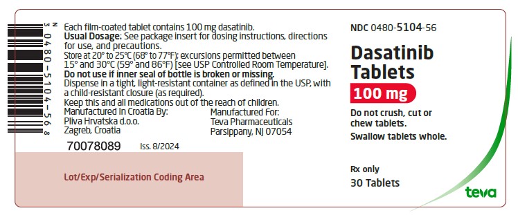 Each film-coated tablet contains 100 mg dasatinib. The usual dosage can be found in the package insert for dosing instructions, directions for use, and precautions. It is important to store the medication at 20°C to 25°C (68°F to 77°F) with excursions permitted between 15°C and 30°C (59°F and 86°F). Make sure not to use if the inner seal of the bottle is broken or missing. Dispense in a tight, light-resistant container with a child-resistant closure. Keep all medications out of reach of children. These tablets should not be crushed, cut, or chewed and must be swallowed whole. The medication is manufactured in Croatia by PVA Hrvatska d.o.o. and manufactured for Teva Pharmaceuticals in Parsippany, NJ 07054. The NDC number for dasatinib tablets is 0480-5104-56.*