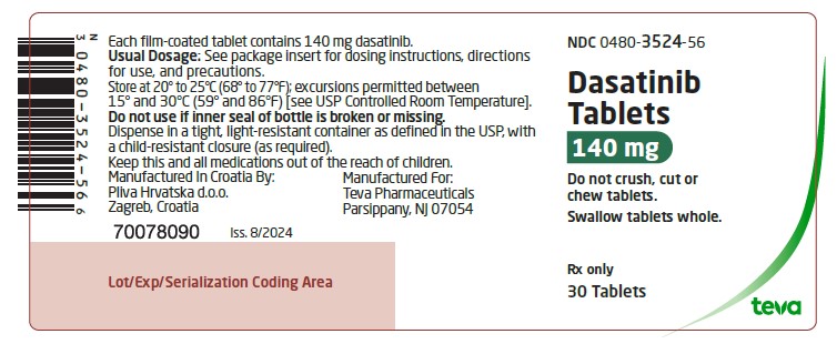 Each film-coated tablet contains 140 mg dasatinib. The usual dosage and storage instructions are provided in the package insert. Do not use if the inner seal of the bottle is broken or missing. Keep out of reach of children. The tablets should not be crushed, cut, or chewed; swallow them whole. The medication is manufactured in Croatia and distributed by Teva Pharmaceuticals. The product details include the NDC code 0480-3524-56.*