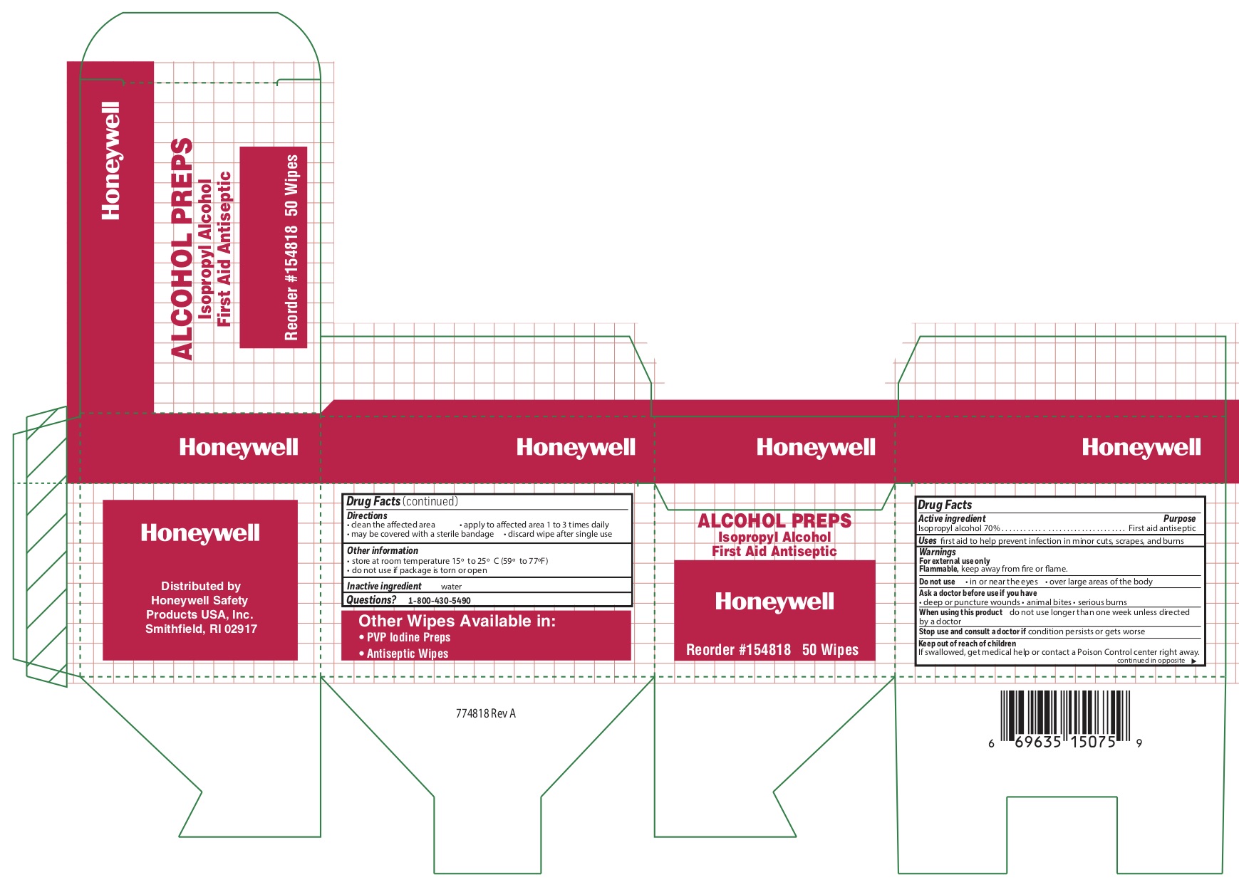 This text is a product label for Honeywell's Alcohol Prep, which is an antiseptic wipe containing 70% isopropyl alcohol. The wipe is for first aid use to help prevent infections in minor cuts, scrapes, and burns. The direction is to apply to the affected area one to three times daily and may be covered with a sterile bandage. The product should be stored at room temperature and should not be used if the package is torn or open. Inactive ingredients of the product include water. The label warns that the alcohol prep is flammable, and users should keep it away from fire or flame. It should not be used near the eyes or over large areas of the body. Users should ask a doctor before use if they have deep or puncture wounds, animal bites, or serious burns. The product should not be used for longer than one week unless directed by a doctor. If the condition persists or gets worse, users should stop using the product and seek medical attention. The product should be kept out of reach of children, and if swallowed, medical attention should be obtained immediately.*