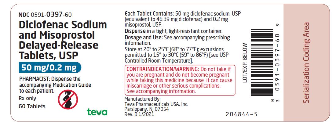 This is a description of Diclofenac Sodium and Misoprostol Delayed-Release Tablets, which are prescription drugs containing 50 mg diclofenac sodium and 0.2 mg misoprostol. Each package has 60 tablets and must be dispensed with an accompanying Medication Guide. The tablets should be stored in a light-resistant container between 20-25°C, and dosage and use instructions can be found in the prescribing information. These tablets are manufactured by Teva Pharmaceuticals USA, Inc. However, it is contraindicated for pregnant women, as it can cause miscarriage or serious complications. The text also includes the drug's National Drug Code and serialization coding area.*