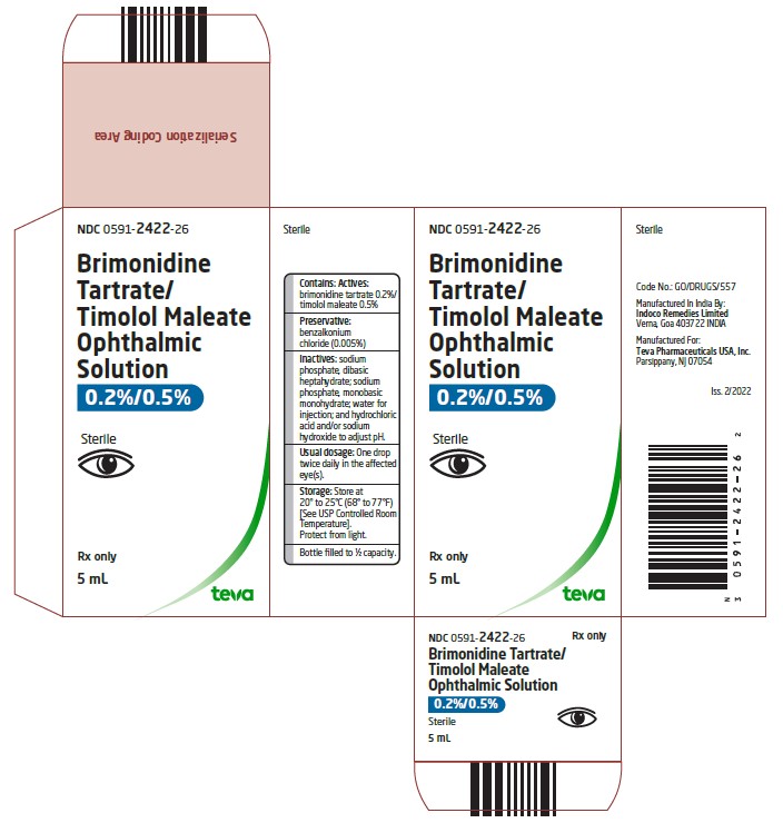 This is a product label for an ophthalmic solution with the active ingredients Brimonidine Tartrate and Timolol Maleate. The product is sterile and comes in a 5mL bottle under the brand name Serte. The product has an NDC code of 0591-2422-25 and is manufactured by Teva Pharmaceuticals.*