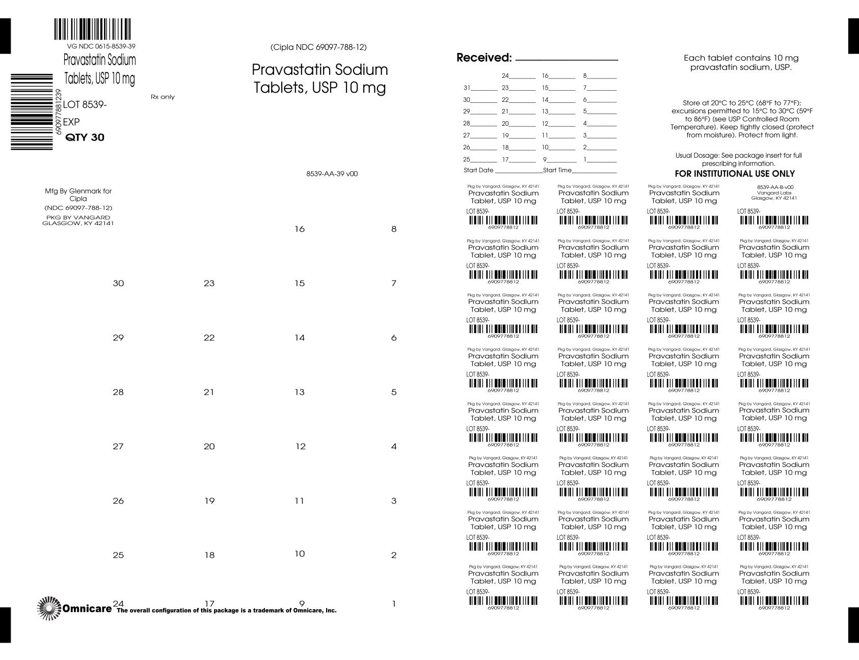 This text contains information related to Pravastatin Sodium tablets, USP 10 mg. It includes details such as the lot number, packaging details, manufacturer (Glenmark for Cipla), and storage instructions. The tablets are intended for institutional use only, and the usual dosage information is suggested to be checked in the package insert or full prescribing information. The manufacturing locations mentioned include Glasgow, KY.*