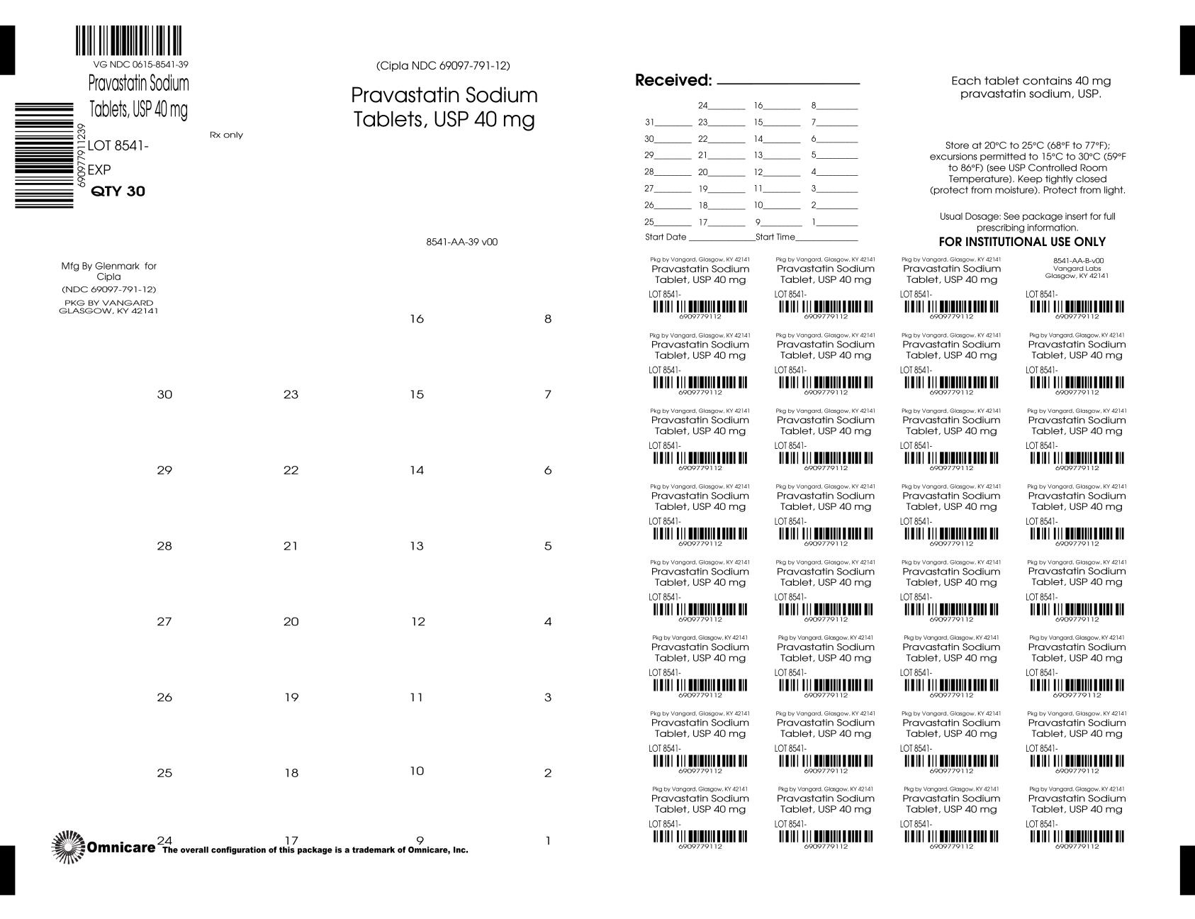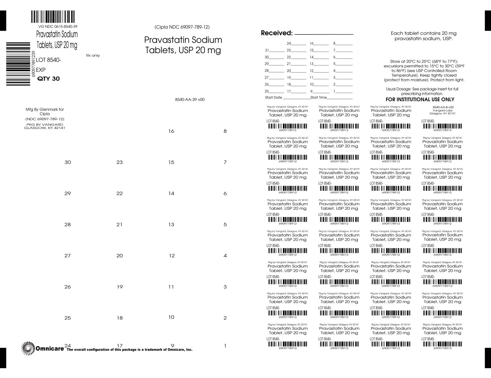This is information regarding Pravastatin Sodium tablets, each containing 40 mg of the active ingredient. The tablets are stored at a temperature range of 20°C to 25°C, with excursions permitted to 15°C to 30°C. The usual dosage should be followed as per the package insert. These tablets are manufactured by Glenmark for Vanguard Labs. The package includes different lots of tablets under the same formulation, denoted by LOT numbers. This medication is intended for institutional use only.*