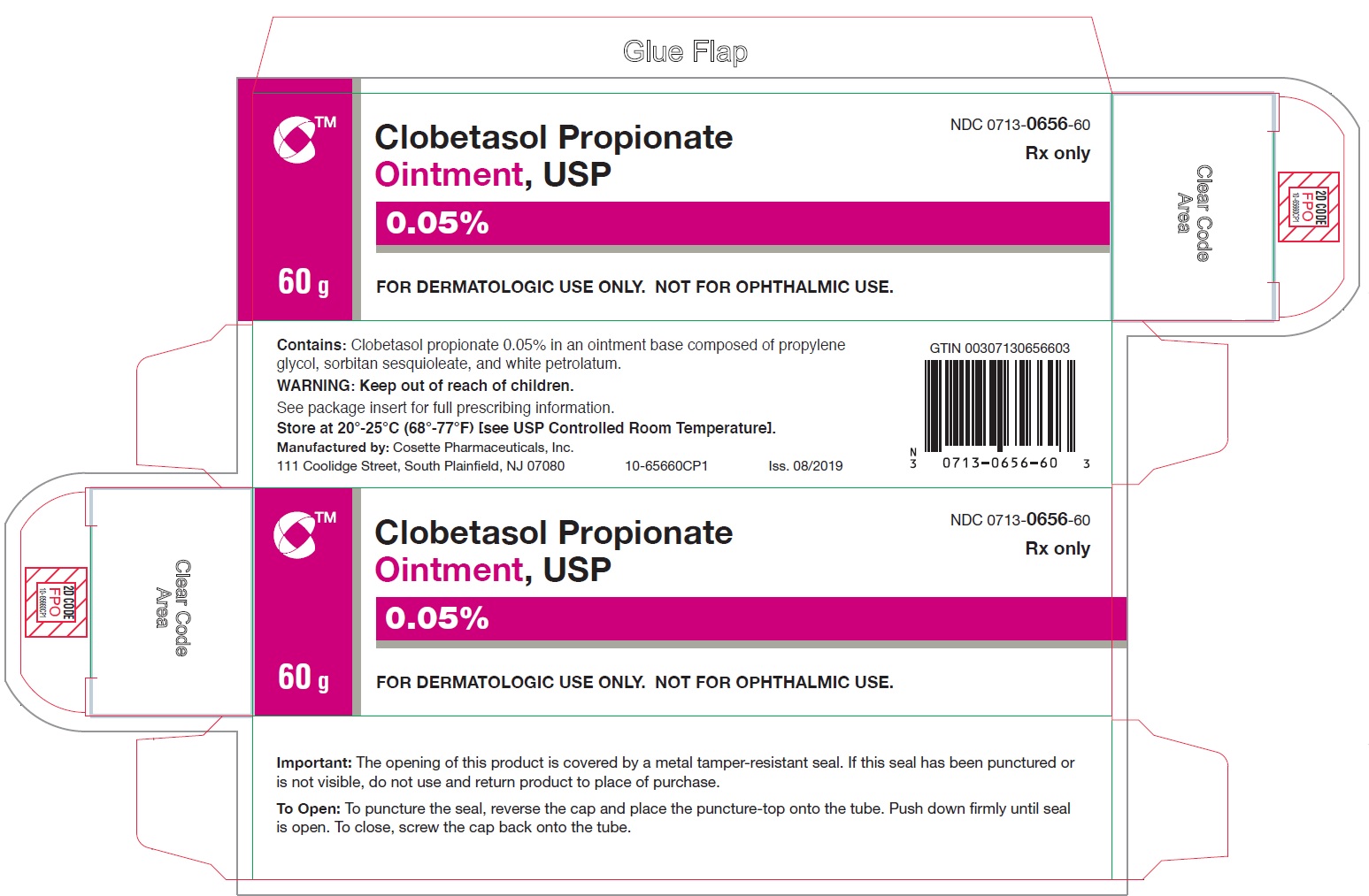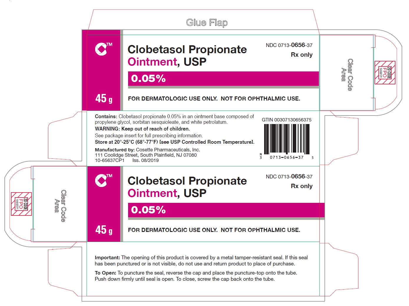This is a medication with the brand name Clobetasol Propionate Ointment, USP 0.05% for dermatological use only. The ointment contains Clobetasol propionate 0.05% in an ointment base composed of propylene glycol, sorbitan sesquioleate, and white petrolatum. It comes with a metal tamper-resistant seal, and the instructions for how to open and close the medication are provided on the package. The medication is manufactured by Cosette Pharmaceuticals Inc. It is for Rx only and not for ophthalmic use. It is important to keep it out of reach of children. The full prescribing information is provided in the package. It has NDC number 0713-0656-37 and GTIN number 00307130656375.*
