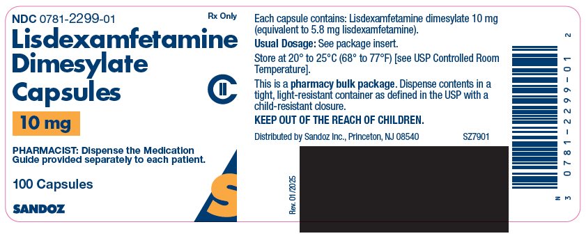 Description: This text appears to be labeling information for a medication with the NDC number 0781-2299-01 containing Lisdexamfetamine dimesylate 10 mg per capsule. It instructs to store the medication at 20° to 25°C, in a specific container, and out of reach of children. The text also mentions that it is a pharmacy bulk package distributed by Sandoz Inc. Pharmacists are advised to dispense the medication guide included separately with each patient. The product consists of 100 capsules.*