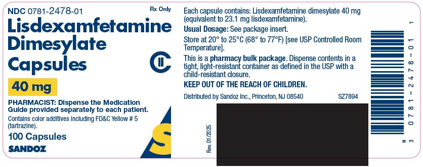 This is a description for Lisdexamfetamine Dimesylate Capsules at 40 mg dosage, with NDC number 0781-2478-01 by Sandoz. Each capsule contains 40 mg of Lisdexamfetamine dimesylate. It is a pharmacy bulk package with 100 capsules. It also lists the color additives and instructions on storage and dosage. The medication guide should be dispensed separately to each patient.*
