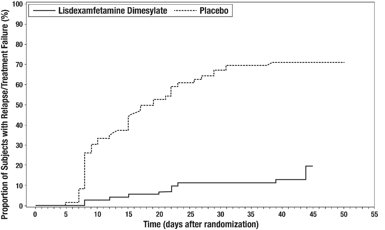 This text provides a graph showing the proportion of subjects with relapse/treatment failure over time in a study comparing placebo with Lisdexamfetamine Dimesylate. The x-axis represents time in days after randomization, and the y-axis shows the percentage of subjects experiencing relapse or treatment failure. The data suggests a difference in outcomes between the two treatments.*
