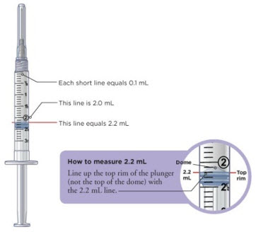 This text provides information about the quantities of liquid in different containers: one container contains 1 milliliter (mL) per short line, another container contains 20 mL, and a third container contains 22 mL.*