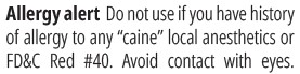 This text contains an allergy alert advising individuals not to use the product if they have a history of allergy to any "caine" local anesthetics or FD&C Red #40. It also warns to avoid contact with eyes.*