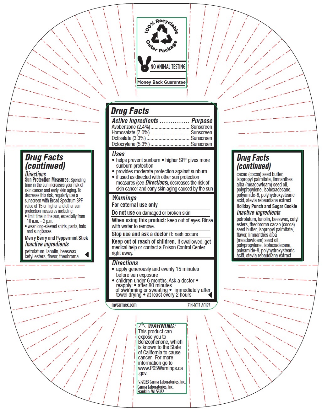 The following 6 images provide visual information about the product associated with Carmex Daily Care Moisturizing Lip Balm Spf15 Broad Sprectrum Minis Holiday NDC 10210-0073 by Carma Laboratories, Inc., such as packaging, labeling, and the appearance of the drug itself. This resource could be helpful for medical professionals, pharmacists, and patients seeking to verify medication information and ensure they have the correct product.