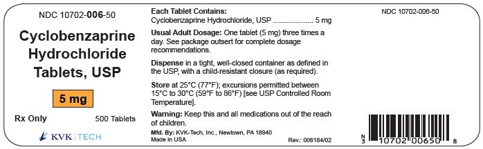 This is a medication called Cyclobenzaprine Hydrochloride that comes in the form of tablets. Each tablet contains 10mg of Cyclobenzaprine Hydrochloride, and the package includes 500 tablets. The medication is only available with a prescription and is intended for adult use. The recommended dosage can be found on the package insert. The tablets should be stored in a closed container at room temperature, and caution should be taken to keep them away from children. The manufacturer is KVK Tech, and the product has an NDC code of 10702-007-50.*